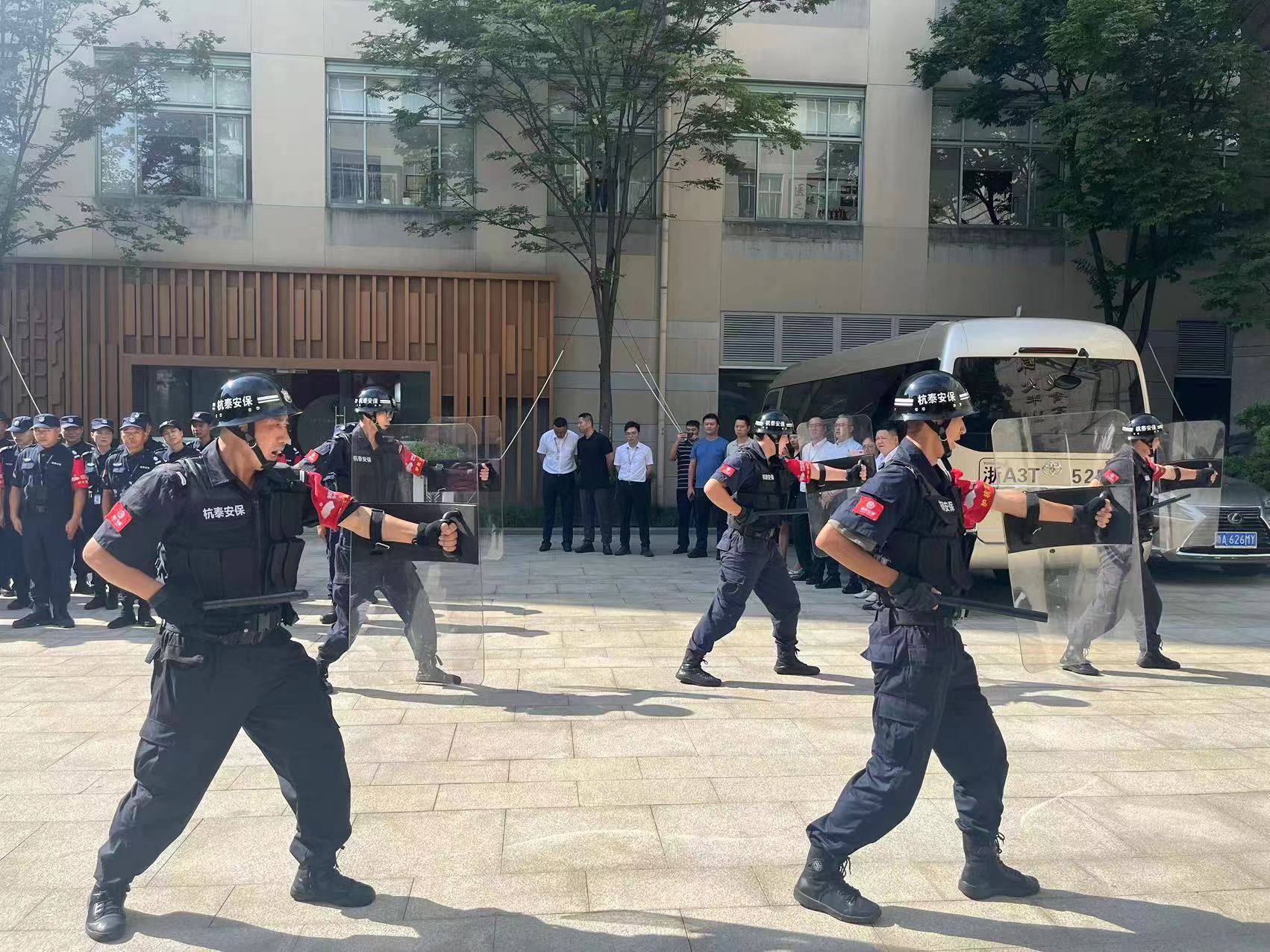 随后,重庆市医院协会安全保卫专业委员会专家一行实地观摩了我院安保队伍反恐防暴盾牌操实战演练,队员们精神抖擞,喊着响亮而整齐的口号跑步进入演示场,在指挥员的指挥下,队员招招带劲、挥拳雄健有力,向客户单位展示了杭泰安保的风采,赢得了在场领导的阵阵掌声。