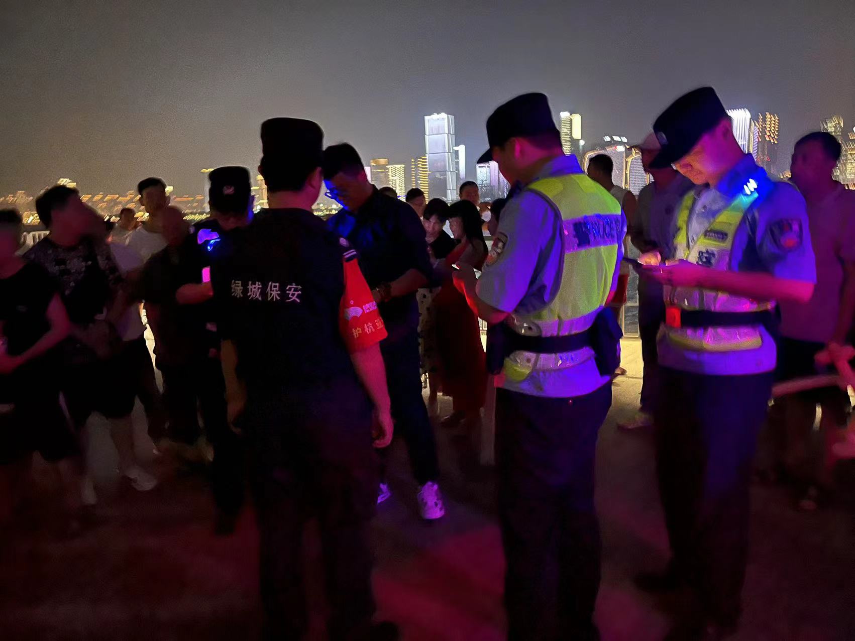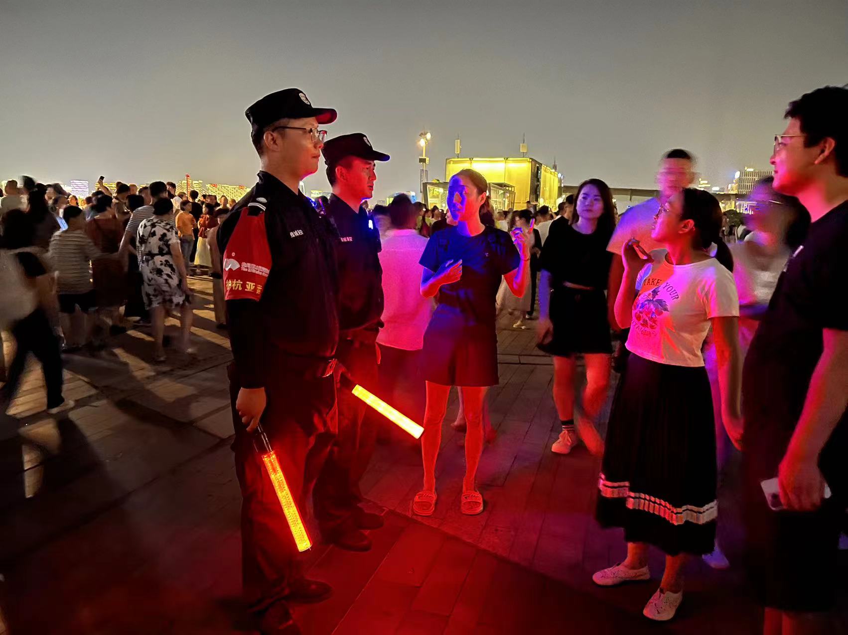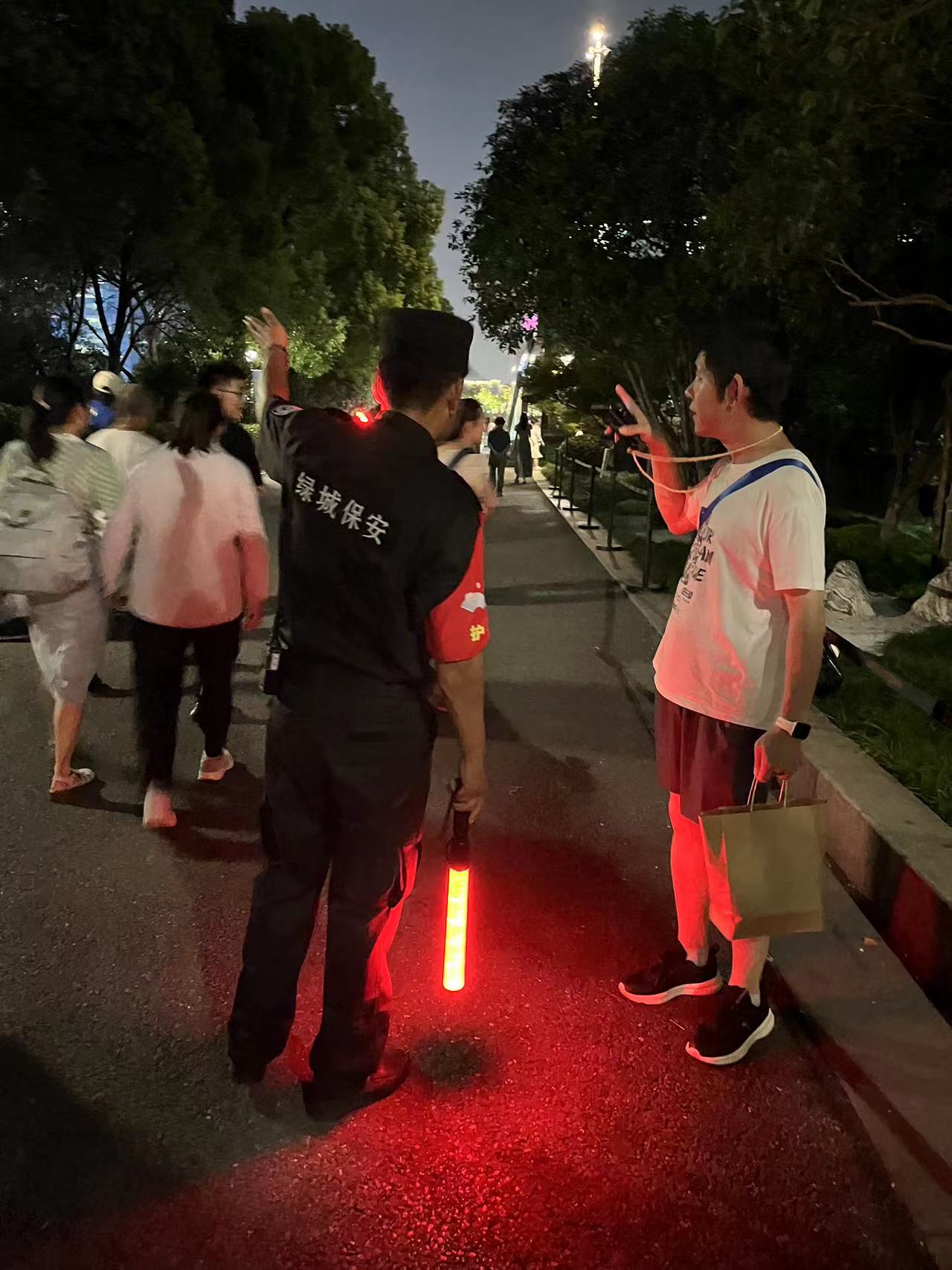 深夜,随着最后一场次的灯光秀落下帷幕,观赏的人群如潮水般一下子从狭小的出口涌出,极易造成人流拥挤引发安全事故,这对已经连续奋战近12个小时的绿城保安队员们来说,更是一波巨大的挑战,他们始终精神抖擞的疏导人流有序离场,确保观赏的市民游客开开心心前来,平平安安返回。人潮散去后,他们拖着疲惫的身躯,协助公安民警拆卸搬离铁马等安保设施,将当天安保工作全部顺利完成,全力以赴确保每一位前来城市阳台观赏的市民游客的观赏安全。
