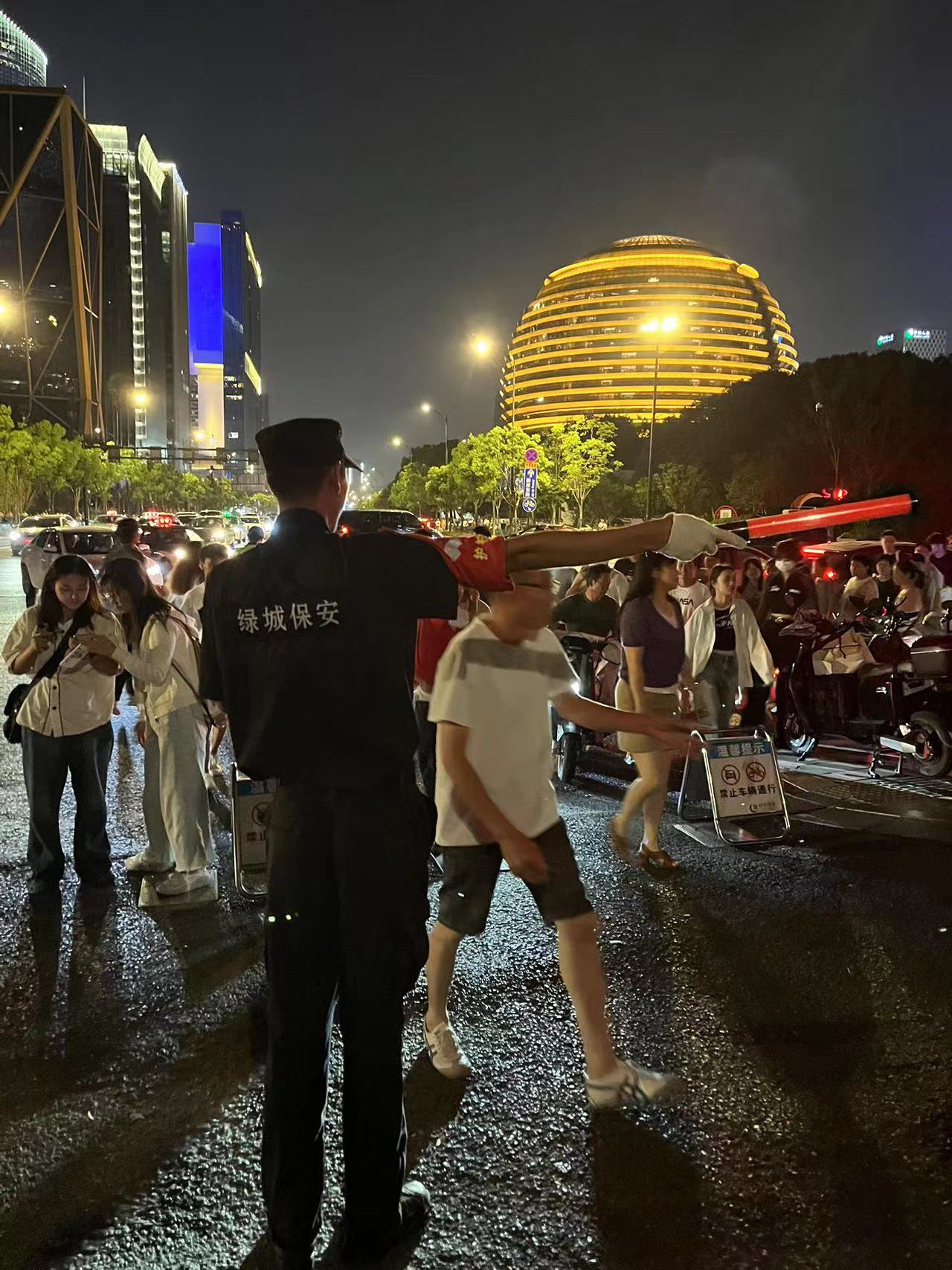 傍晚,随着夜幕逐渐降临一场场万众瞩目的亚运灯光秀正式在钱塘江畔上空绽放。此时,城市阳台已经涌入超过10万余人,整个阳台的人潮犹如春运的车站,密不透风,摩肩接踵。此时,队员们也迎来了一天中最大的挑战,他们分分秒秒神经紧绷,在现场公安民警的带领下,全力以赴开展治安巡逻、维持秩序、疏导人流等警保联动工作,拉隔离栏,围人墙防护,佩戴肩灯,手拿喊话器不断提醒市民游客注意安全。在确保安全的同时,他们还从服务细节入手充当“活地图”,化解市民游客之间矛盾56起,帮助市民游客寻找走散家人69人次,仅9月9日晚就帮忙找老人5人次、找走丢的小孩13人次。两场次的灯光秀下来,绿城保安队员们无暇抬头看一眼璀璨夺目的绽放美景,而是毅然的背对钱塘江竭力守护着群众安全,各个汗流浃背,嗓子冒烟,却没有一个喊苦喊累,没有发生一起安全责任事故,赢得了公安机关的高度赞誉和市民游人的一致点赞。
