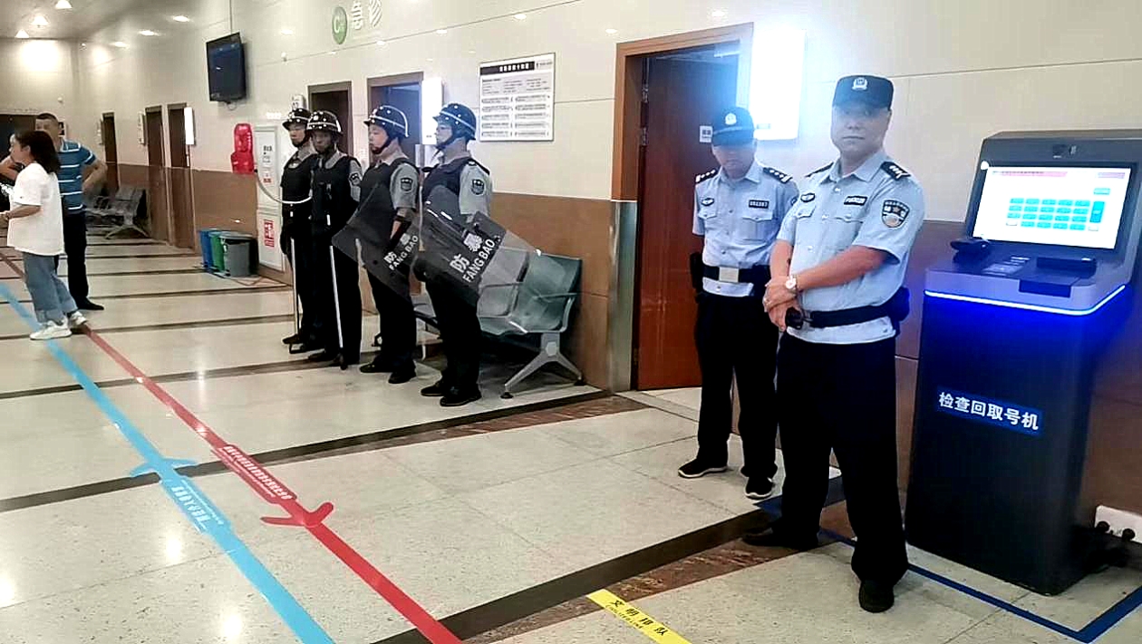 实战模拟“数名可疑人员持刀具、汽油桶闯入医院门诊大厅拉横幅医闹,试图在人群密集场所引燃汽油制造大型人员伤亡事故”和“大型运动会发生大规模人员踩踏,造成大型人员受伤急救”等情景,实景检验医院安保队伍应对不同突发社情时的安保处置能力和大型医疗救治行动的现场管控能力。