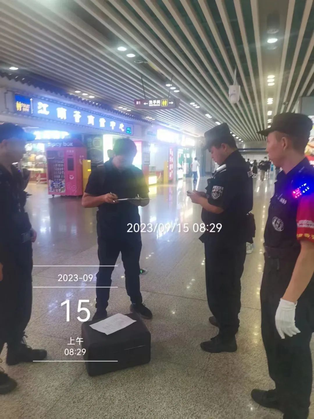 9月15日,火车东站东广场地铁通道,巡逻队员发现有携带无人机,进行拦截控制现场,上报处置。