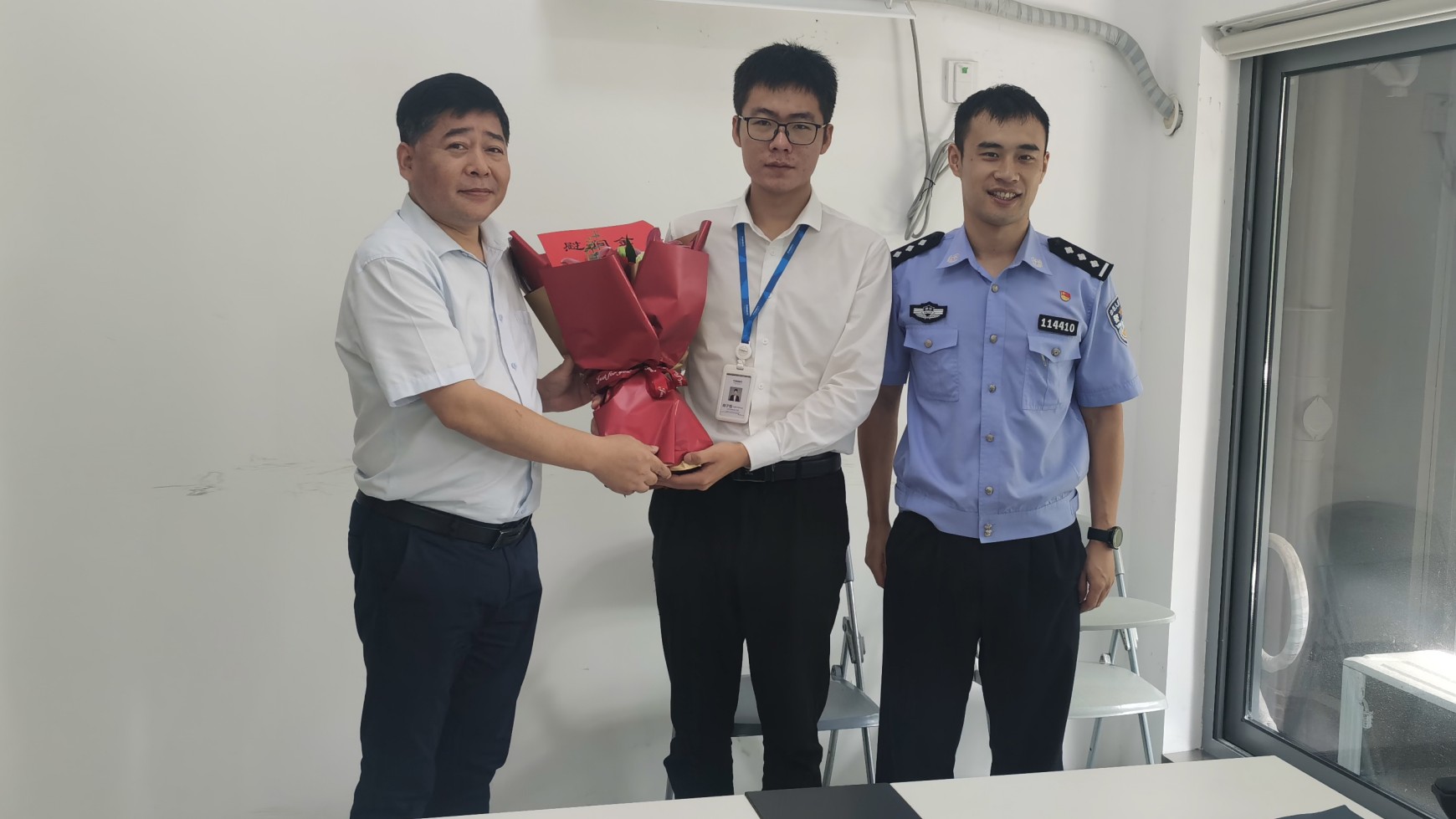 9月25日上午,余杭区保安协会副会长张荣虎代表协会前往良渚万科未来城二期,对会员单位万御安防公司见义勇为保安员陈子恒进行上门慰问,良渚派出所管区民警受邀参加慰问座谈。期间,根据《余杭区保安协会慰问管理制度》(试行),为其送上鲜花和慰问金。
