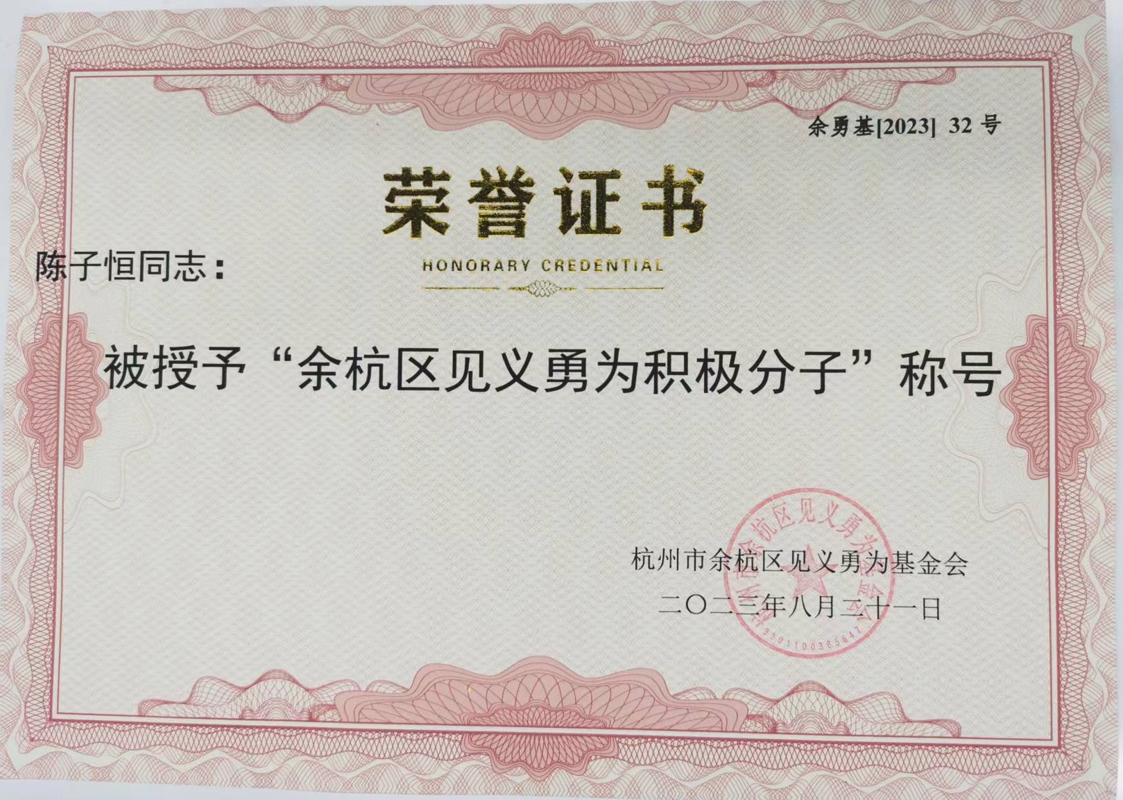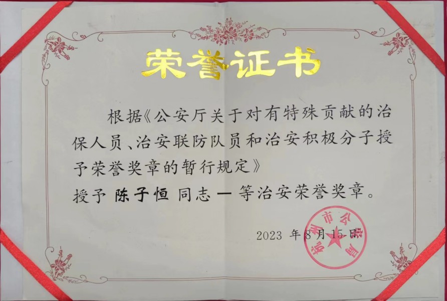 陈子恒主要事迹:2023年7月28日晚,陈子恒在杭州市余杭区良渚街道未来之光区块开展“夜间一小时”亮灯巡逻,发现一名可疑男子在街边徘徊,情绪激动、行为异常,意识到该男子有重大风险,在呼叫单位同事支援同时,并将该情况及时向良渚派出所报告,同时以聊天的方式稳住该男子,配合公安机关成功将该人予以现场控制,及时消除一起重大风险隐患。因其突出表现,被表彰为“余杭区见义勇为积极分子”,并获得市公安局颁发的一等治安荣誉奖章。