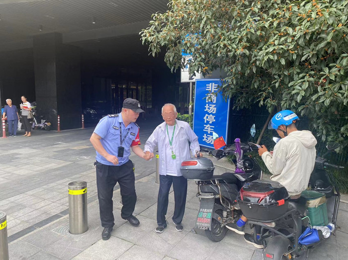 午后的中大银泰城,人头攒动、顾客如云。武林安保驻石桥反扒队队员肖健峰,像往常一样,带着一双锐眼,穿梭在人流中。在商场5号门口,肖健峰看见一位老人步履蹒跚地走过来,从摇摇晃晃地走姿可以判断老人腿脚不便。他急忙迎上去。经询问,老人住在朗和医院,因为假期也想赶个热闹就出来逛逛,谁知走到银泰门口腿脚就不行了,举步维艰。见状,肖健峰在征得老人同意后,便扶着老人一路护送至郎和医院,老人感动地握住肖健峰的手久久不愿松开。