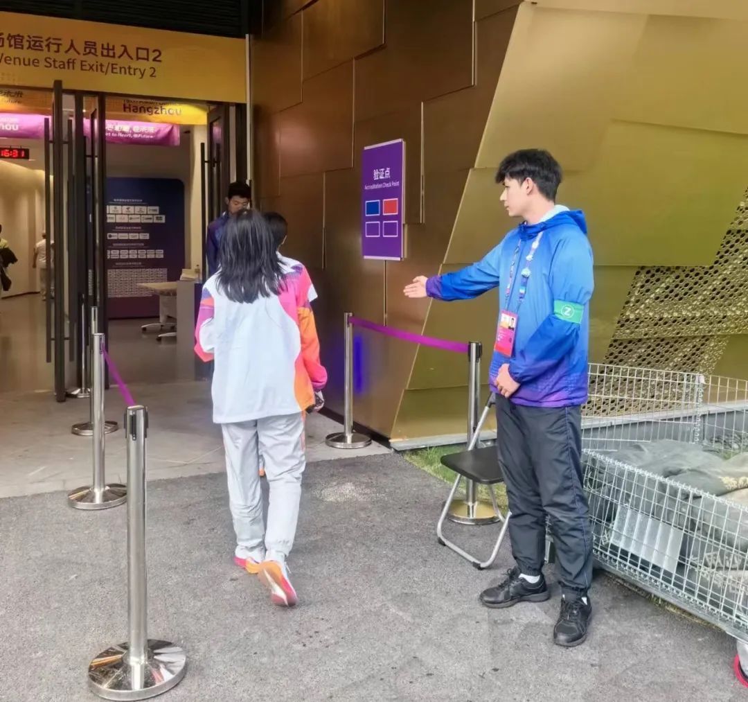 亚运期间,队员们以亚运使命在肩的责任感,在工作岗位上连续奋战、不懈坚守、默默付出在护航亚运“战场”上。出入口、安检口、验证点......在场馆各处都能看到他们辛勤值守的身影。特别是在日均人流量上万余人次的亚运场馆安检口,面对陆续进场的大量观众时,安检员严阵以待、有条不紊地确保观众快速有序入场。他们手持安检仪,不断重复“举起、蹲下、起身”等动作,干净利落地完成本职工作的同时,还时不时化身“临时志愿者”,热心帮助观众解决疑难问题。