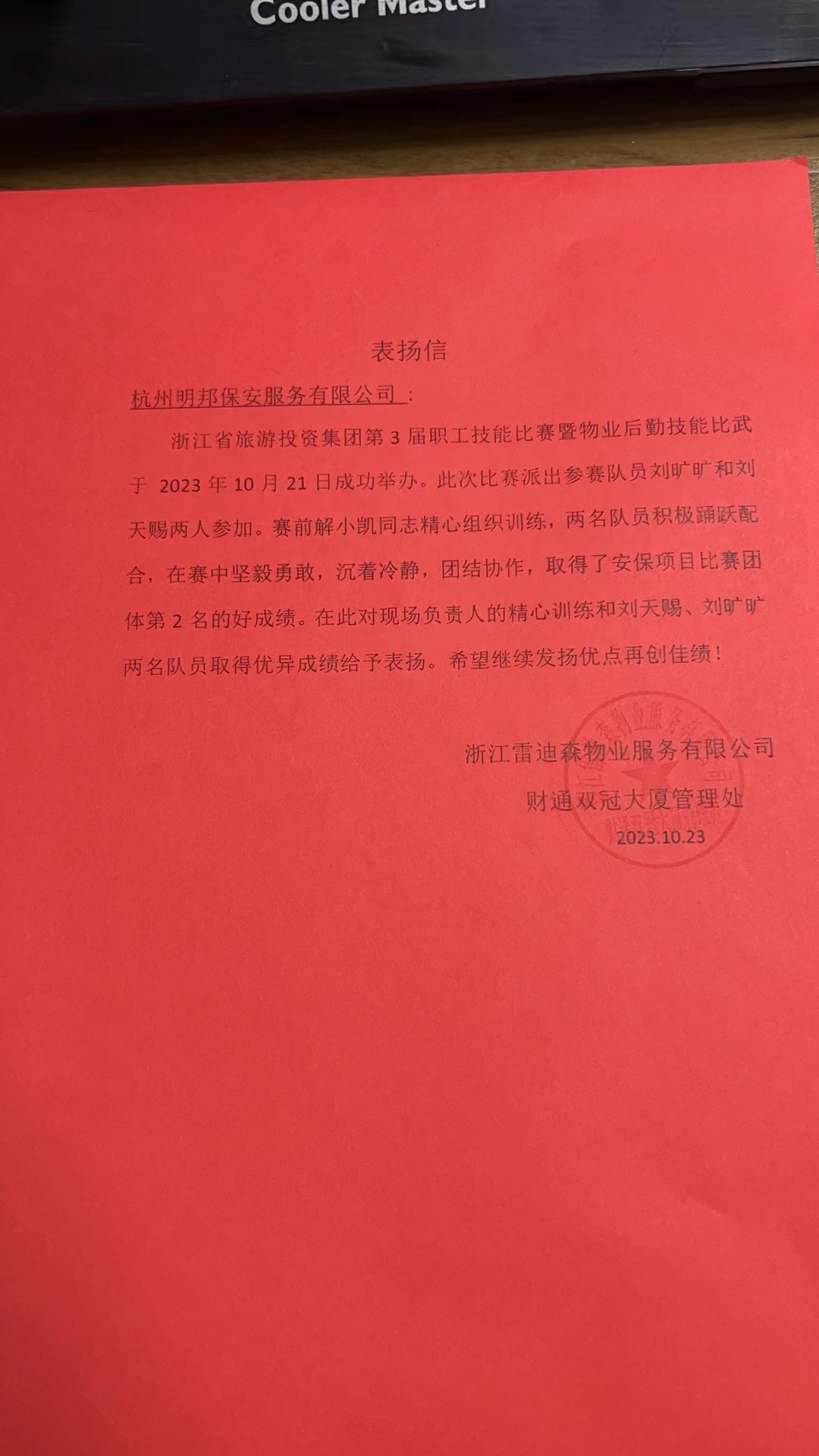 10月21日上午,明邦保安驻雷迪森财通双冠大厦项目参加了浙江省旅游投资集团第三届职工技能大赛暨物业后勤技能比武大赛活动。本次活动由浙旅投集团工会主办,浙勤集团工会、雷迪森物业公司联合承办。