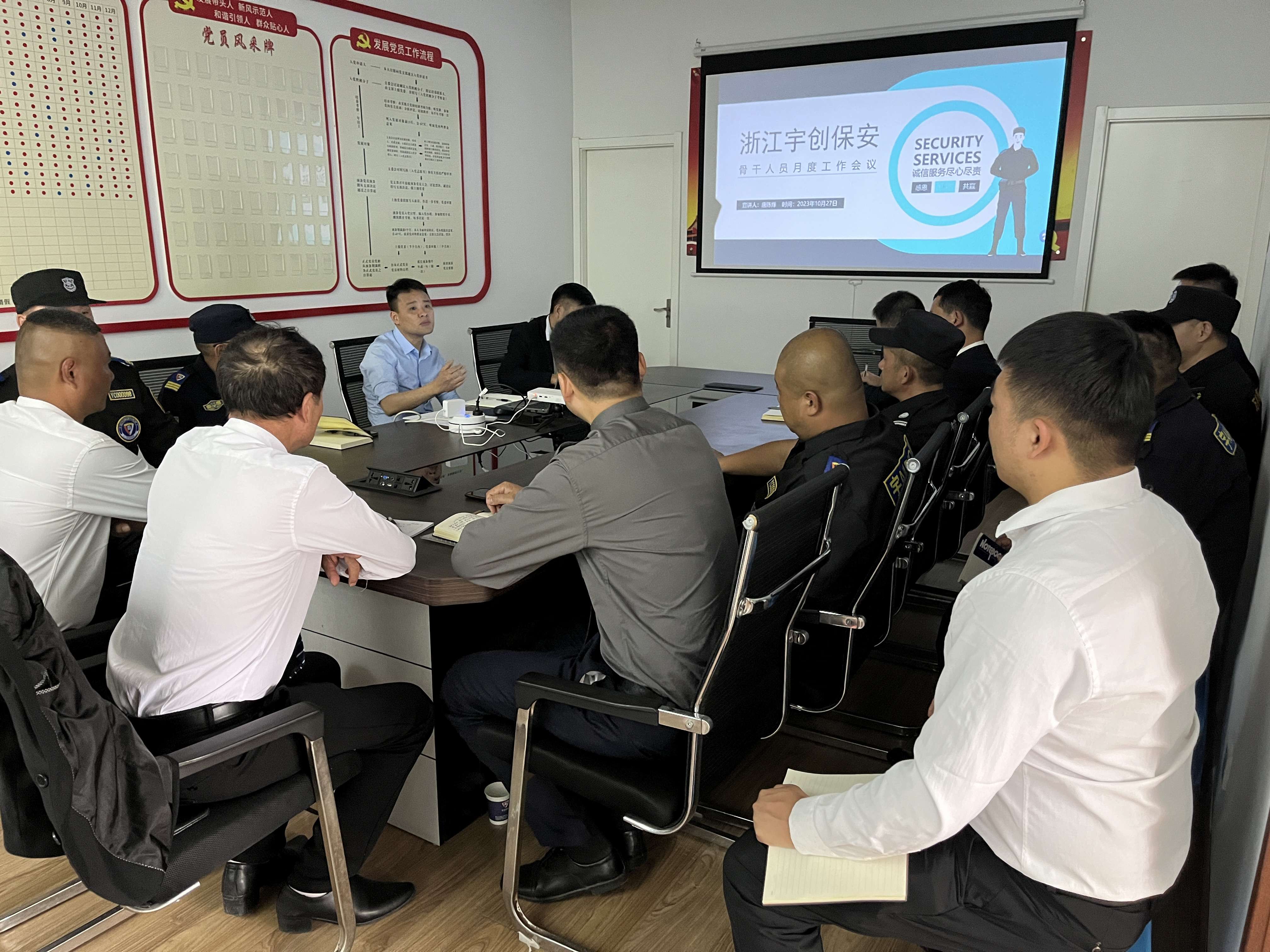 2023年10月27日下午,浙江宇创保安服务有限公司召开“宇创安保骨干月度会议”。会上董事长和常务副总在月度例会上发表讲话。