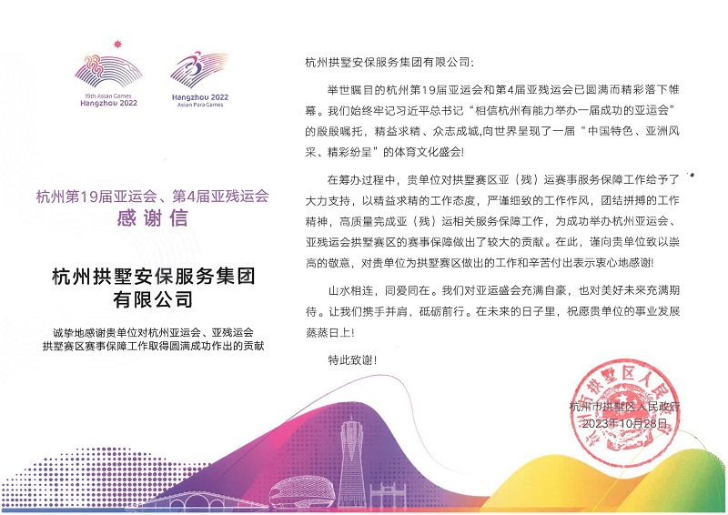 近日,公司收到一封意义非凡的感谢信,它是从杭州市拱墅区人民政府发来的,感谢公司为亚(残)运赛事服务保障工作提供高质量服务,并对护航亚(残)运会期间给予大力支持与辛勤付出表示肯定。纸短情长,情真意切,这份荣誉的背后凝结了所有参战人员汗水,透过文字似乎还能感觉到护航平安“战场”上“幕后英雄”们所留下的热情,无形中又勾勒起独属于他们的“亚运记忆”。