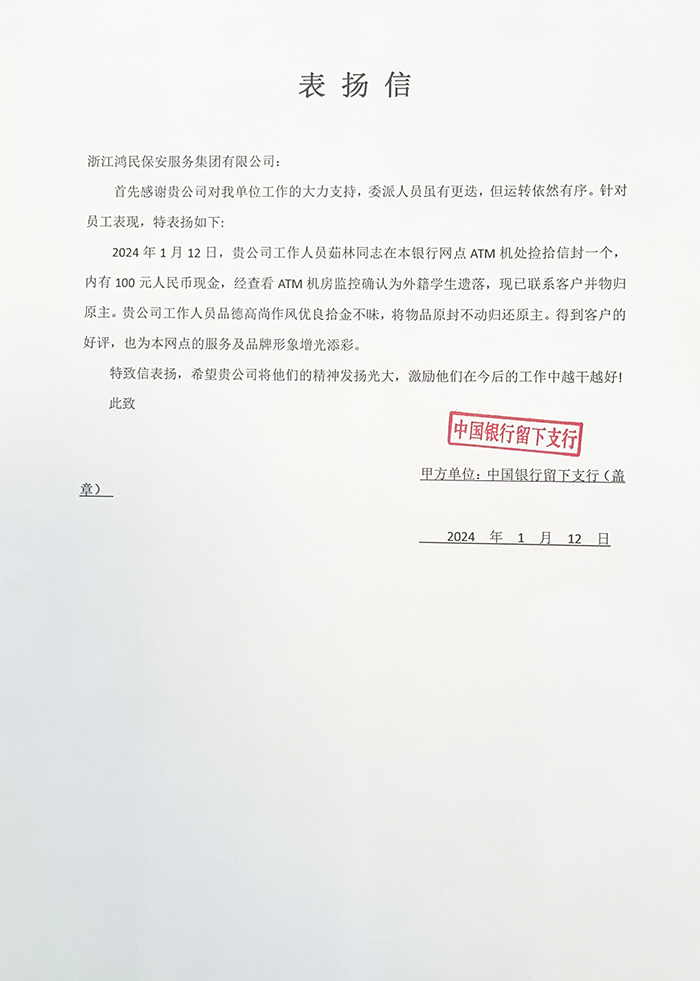 2024年1月12日,浙江鸿民保安服务集团有限公司收到甲方单位一封特殊的来信,来信除了对公司长期以来的服务表示了认可外,特别重点表扬了公司驻点保安员茹林同志拾金不昧的优秀表现。不仅弘扬了中华传统美德,而且提升了甲方单位金融安全服务的品牌形象。来信如下:
