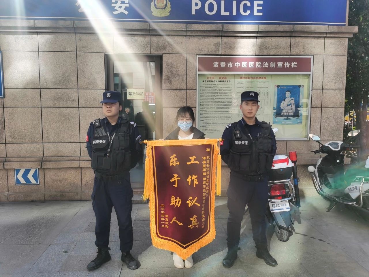 锦旗背后的故事发生在2024年1月19号的上午,诸暨市中医医院的门诊大厅内,一名患者家属急需帮助,便向正在大厅内站岗的特保队员王振寻求帮助。王振通过对讲机呼叫了另一名队员位周阳,两位特保队员协助家属将患者带去放射科做检查,并在患者检查完成后送往1号楼10楼住院部。因患者家属一个人照顾她爸爸不方便,王振和位周阳在现场陪护了两个小时,并将事件上报给了保安队长和医院保卫科。患者家属非常感动,向王振和位周阳在其父亲就医过程中给予的帮助表示深深的感谢。