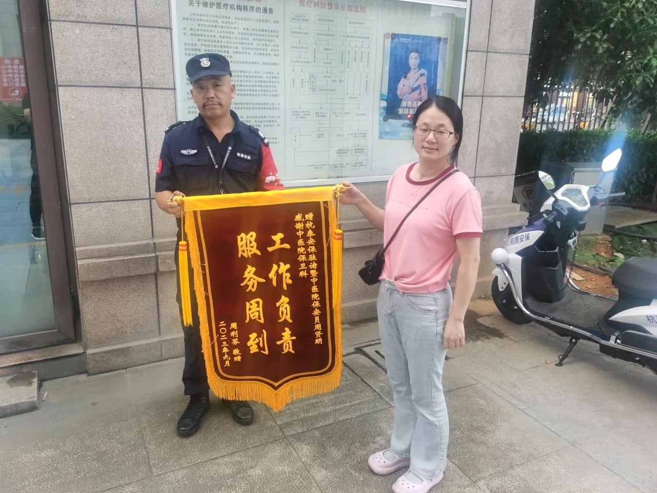 2023年8月30号上午11点30分,保安班长周贤明在巡查岗位的过程中,发现有一位独自前来就医的老人行动不便,需要帮助。在了解了情况后,周贤明便一直陪同在老人,从到放射科做检查,再去手术室做手术,直到医生确认老人安全后,周贤明才离开。几日后,老人的子女将一面写有“工作负责,服务周到”的锦旗送到医院保卫科,向周贤明表示由衷的感谢。