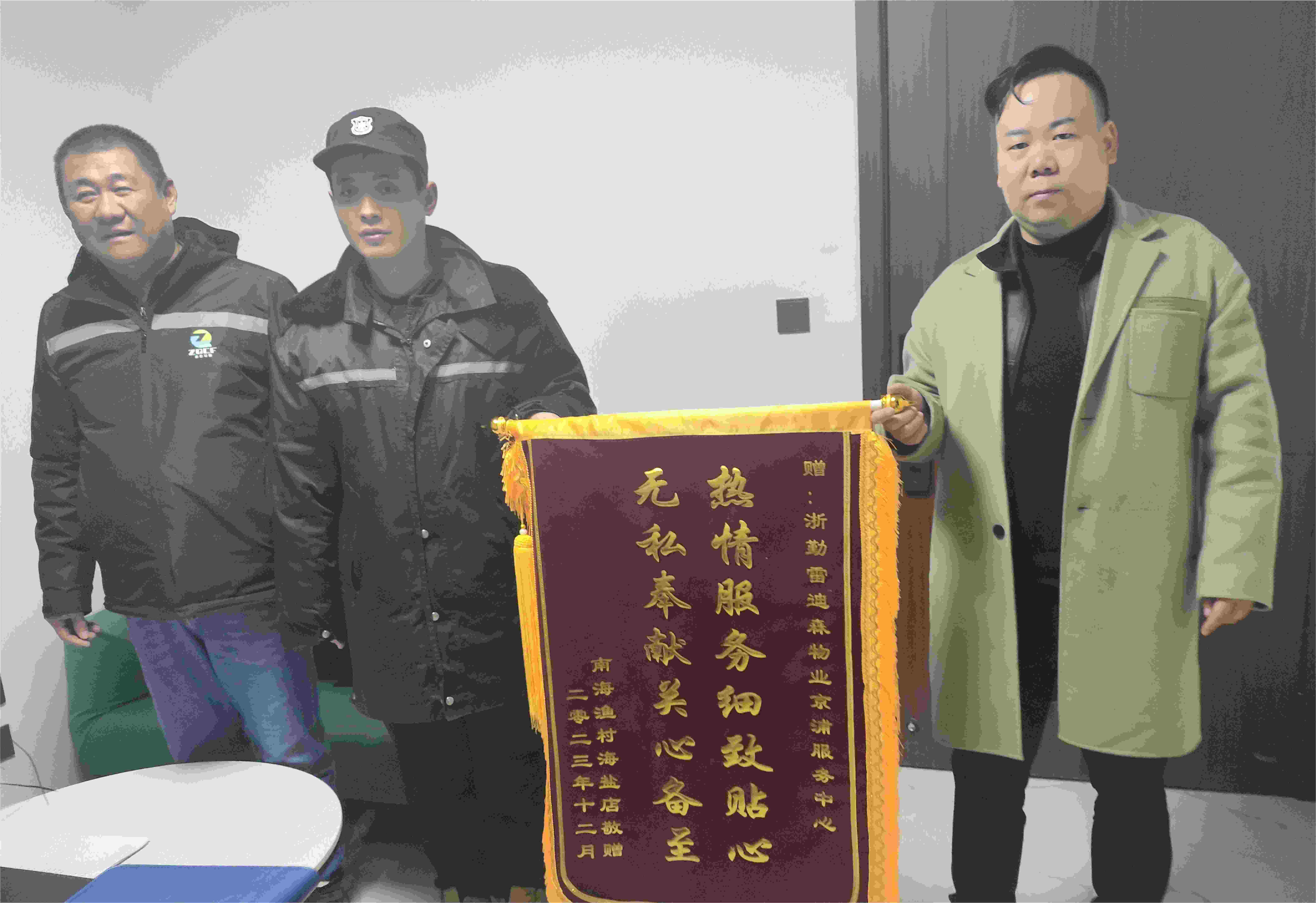 桩桩件件事虽小,热心援助暖人心。业主因此想提供现金表示感谢,被安保队长婉言谢绝,并告诉业主,“您是我们的业主,我们为您解决问题是应该的”。我司安保队长用行动诠释职责,业主特赠予锦旗一面以示感谢与表扬。