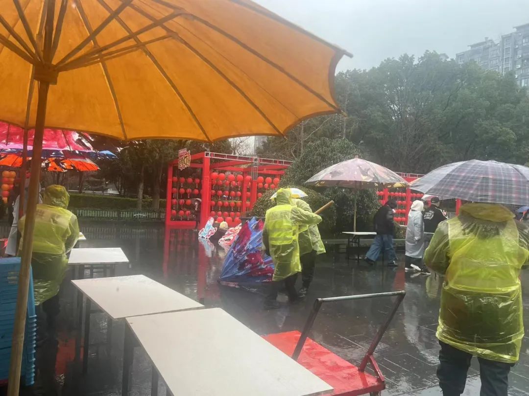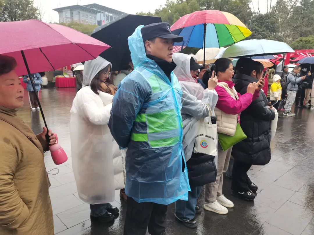 虽然活动当天天公不作美,淅淅沥沥下着小雨,但都无法抵挡市民群众们“噶闹忙”的热情,活动现场人头攒动,热闹非凡。为保证活动顺利进行,队员们身披雨衣,伫立在人群中、行走在群众间,各司其职、多措并举地开展各项安保工作。