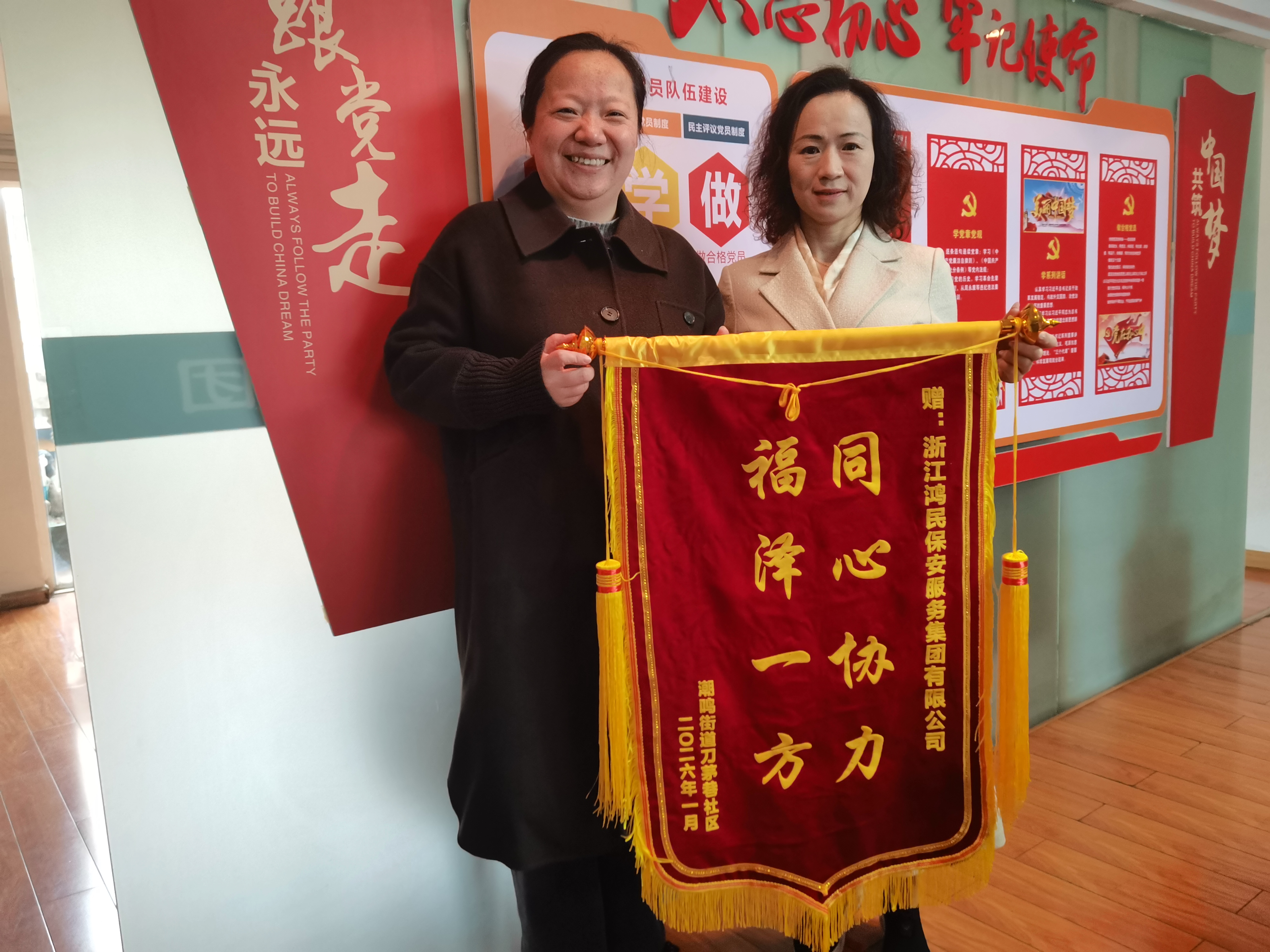 1月27日上午,潮鸣街道刀茅巷社区给浙江鸿民保安服务集团有限公司赠送了一面写有“同心协力 福泽一方”的锦旗,以此表彰我司在推动社区发展、参与公益事业、履行社会责任方面作出的积极贡献。