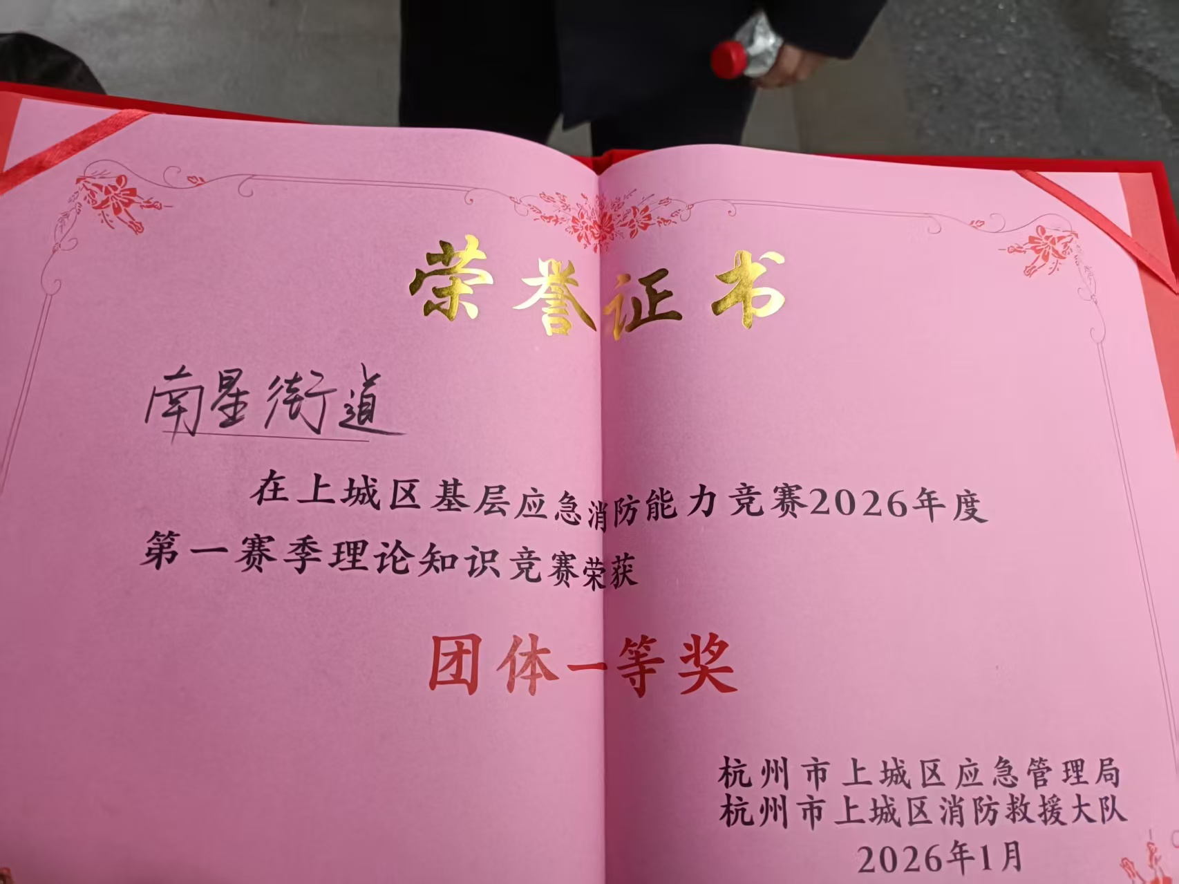 在2026年度上城区基层应急消防能力竞赛第一赛季理论知识竞赛中,我司派驻南星街道综管队员参赛,凭借扎实的理论储备、默契的团队协作,沉着应答、奋勇争先,成功斩获团体一等奖,充分展现了团队过硬的综合素养。