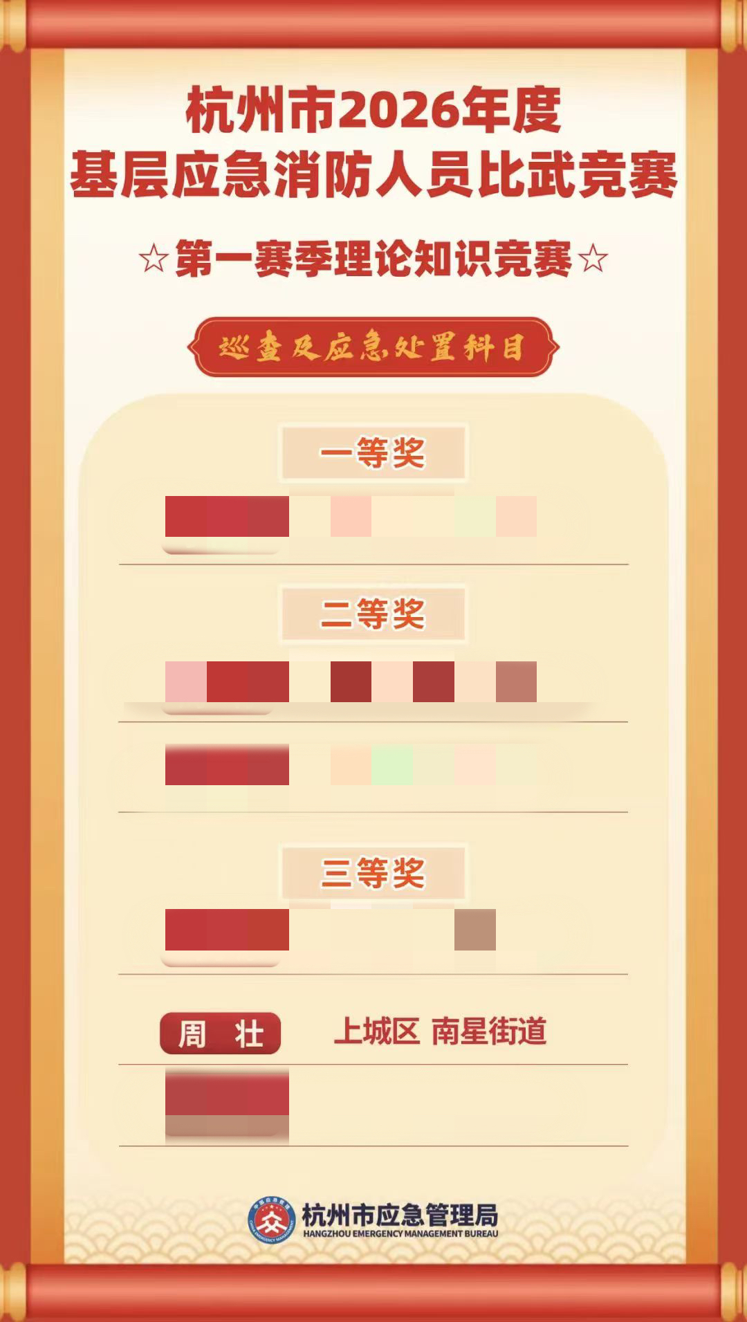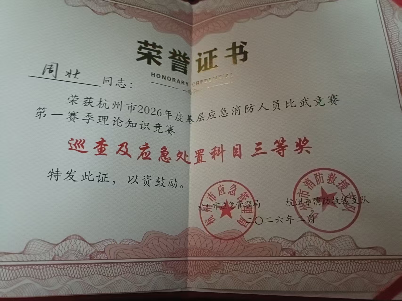 同期,在杭州市2026年度基层应急消防人员比武竞赛第一赛季理论知识竞赛中,我司队员周壮表现突出,在巡查及应急处置科目中,严格遵循规范流程,精准排查隐患、科学处置模拟场景,凭借娴熟技能与严谨态度脱颖而出,荣获个人三等奖。