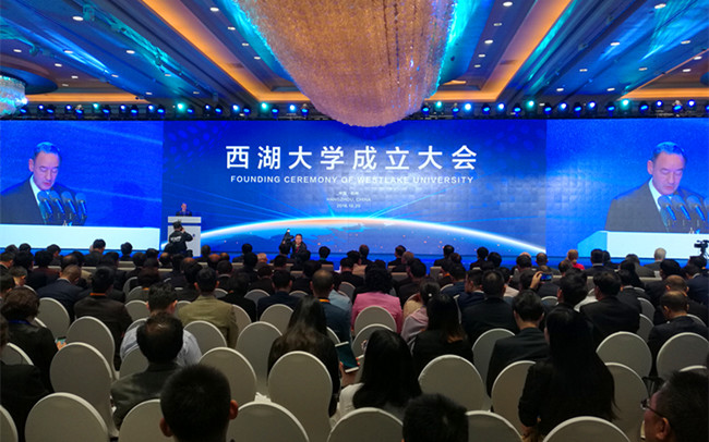 大会现场,全国高校设置评议委员会主任,教育部原党组副书记、副部长杜玉波宣读教育部贺辞。西湖大学校长施一公发表题为《磨砺以须,倍道而进》的致辞,分别以西湖之梦、西湖之始、西湖之路、西湖之幸四个篇章,描绘了西湖大学的定位和目标,即努力成为中国高等教育改革的探索者、拔尖创新人才培养的摇篮、世界前沿科学技术的引领者以及国际化的高等学府。