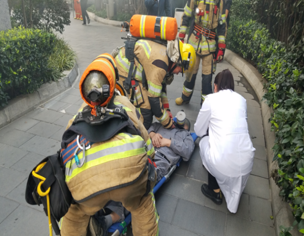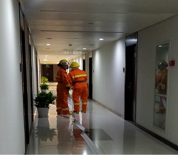 2、下午16 点10 分启动消防广播,模拟9 楼办公室发生火灾。消控通知业主从东、西消防通道紧急疏散撤离。保安队员在第一时间赶到9楼进行营救。