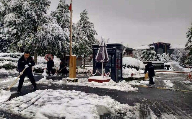 2018年12月7日23点左右,杭州市迎来了2018年终的第一场降雪,8日持续整天鹅毛般大雪,直至12月9日,杭州降雪间歇,截止上午6时,杭州城区积雪2-7厘米,对市民交通出行和日常生活造成影响。杭州市安保服务集团有限公司保安二部及时启动应急预案,“以雪为令”动员各辖区执勤点,驻点单位进一步提高认识、明确责任、强化措施,高标准、高效率、高要求的完成清雪工作,最大限度消除安全隐患,确保客户单位生命财产安全和道路安全畅通。