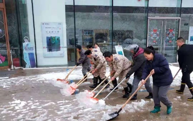 三、企事业单位:9日凌晨,城西银泰城、君尚金座、乐佳国际大厦、临平银泰、万科桂苑、旭化成氨纶、烟草市公司、杭州卷烟厂立即启动24小时应急值守制度,清雪机械与工作人员紧密配合,分工明确、责任到人,各执勤中队扫雪保安员按照”以雪为令、随下随清、扫雪除冰保畅通”的标准,认真履职尽责,迎风雪、战严寒,大家以高涨的热情,齐心协力,手持铁锹、扫帚、推板等工具,认真清扫责任区域积雪,以实际行动为客户安全出行、通畅出行保驾护航,使各执勤点又见最美的“黑白分明”。