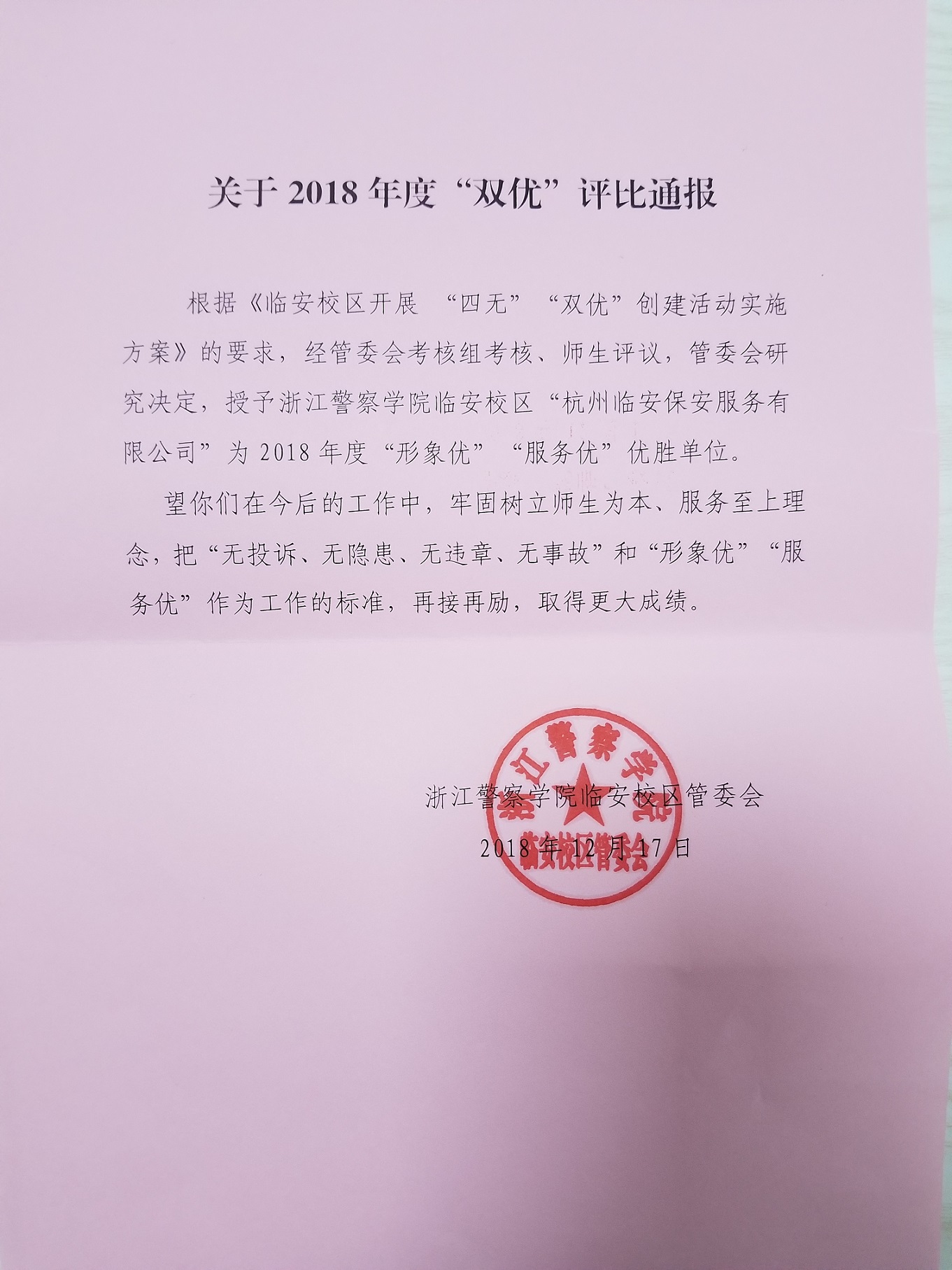 2018年12月17日,杭州临安保安服务有限公司,荣获浙江警察学院临安校区管委会颁发的2018年“四无双优”优秀物业称号。