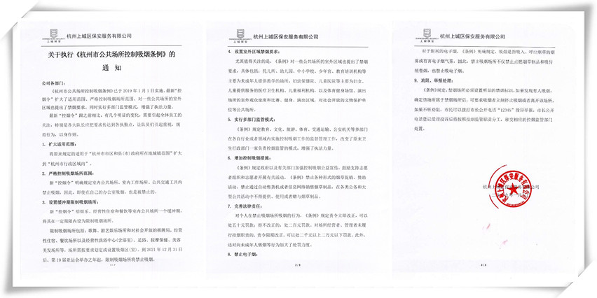 根据新版控烟条例,杭州上城保安积极响应,为创造无烟工作环境,切实采取有效措施,扎实推进“禁烟从我做起”活动的开展。加强现场管控,公司领导起带头作用,率先戒烟、禁烟、控烟,狠抓控烟工作的落实。加强宣传,在各办公室、公司宿舍等区域张贴禁烟标志,规定室内严禁吸烟,使所有员工都能自觉遵守公司控烟管理规定,从而更有效的构建无烟环境。