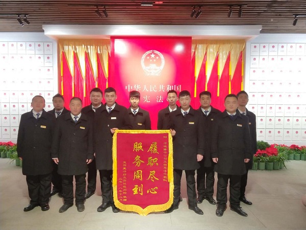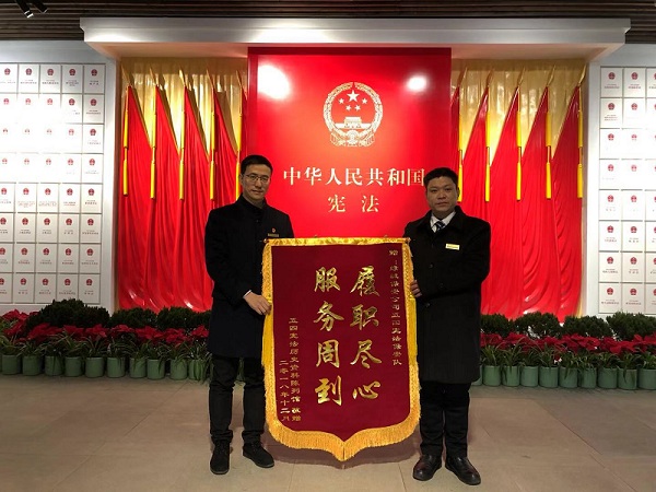 2019年1月11日,五四宪法历史资料陈列馆王馆长给我们浙江绿城保安服务有限公司五四宪法馆保安队授予了“履职尽心,服务周到”的锦旗,这是宪法馆领导对于我们保安队2018年度工作的高度认可,也是对我们绿城保安公司的认可。