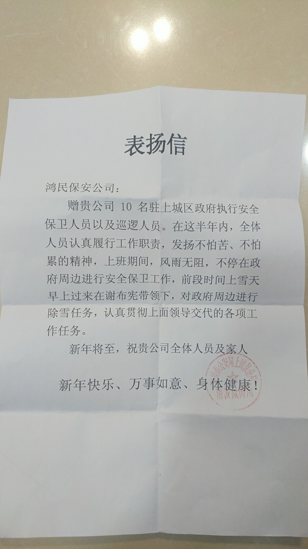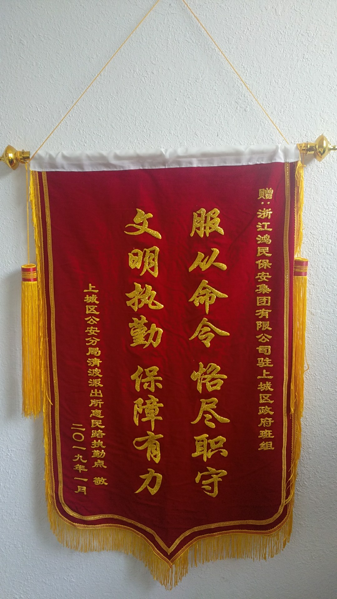2019年1月23日下午,阳光灿烂之际,杭州市公安局上城区分局清波派出所的工作人员带着锦旗与表扬信来到浙江鸿民保安服务集团有限公司,就鸿民集团驻上城区政府执勤时的工作表现做了肯定与表扬,并现场赠送了锦旗。