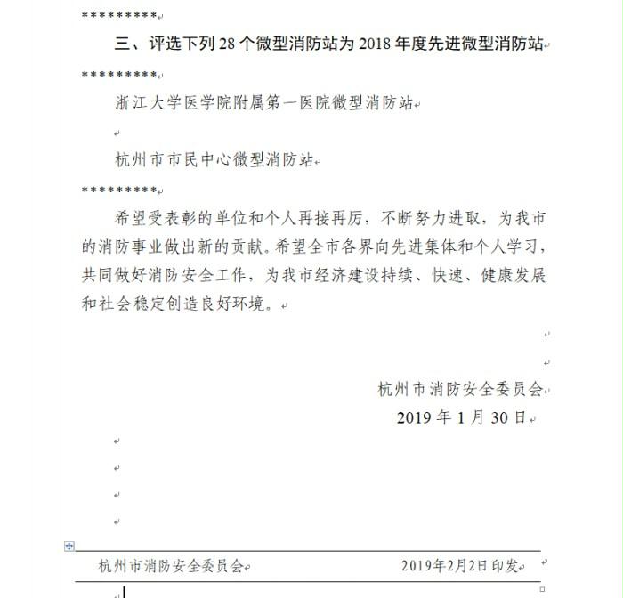 近日,杭州市消防安全委员会表彰了2018年度消防安全工作先进单位及先进个人,杭州市安保服务集团有限公司驻杭州市市民中心、浙江大学医学院附属第一医院等微型消防站被评为“杭州市2018年度先进微型消防站”。