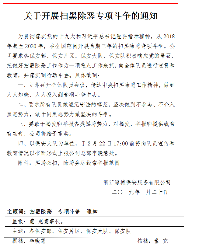 2019年2月21日,浙江绿城保安服务有限公司关于开展扫黑除恶专项斗争的专题会议在公司四楼会议室召开。公司董事长兼总经理董克、安全管理中心副经理闫旭、叶忠以及在杭地区各保安部、保安片区、保安大队、保安队等400多名主管参加了会议。会议由公司董事长兼总经理董克主持。
