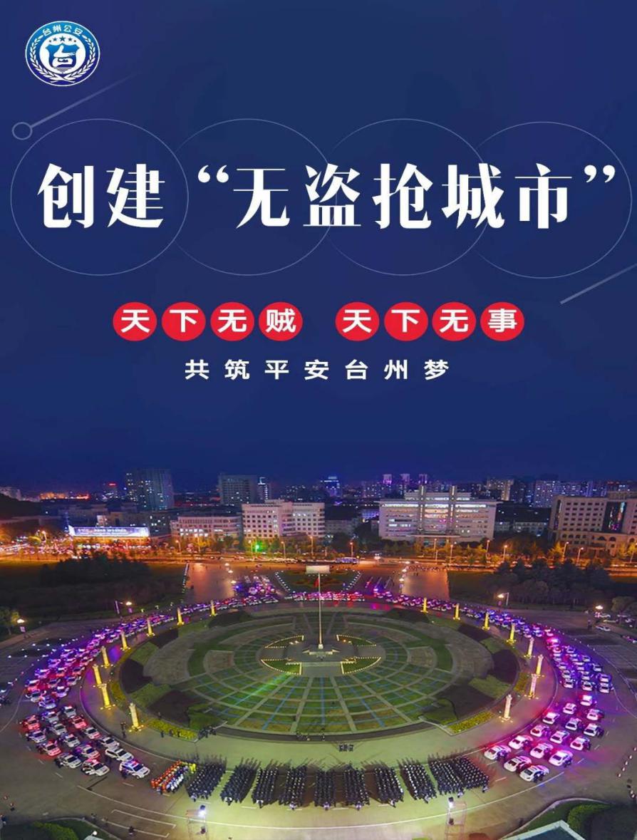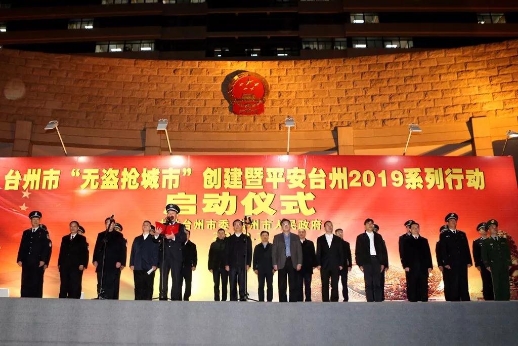 1月9日晚,台州市在市政府广场举行全市“无盗抢城市”创建暨平安台州2019系列行动启动仪式,决心用两年时间集中攻坚,实现“三个不发生”,即力争不发生“盗抢骗”案件引发的命案或受害人自杀等恶性案件,力争不发生“两抢”案件,力争不发生损失100万元以上诈骗案件;实现“三个确保”,即确保“盗抢骗”案件数量持续断崖式下降,确保全市社会治安形势根本性扭转,确保群众安全感、满意度、获得感大幅度上升,着力将台州打造成全国首个“无盗抢城市”。此次活动受到了央视等媒体的高度关注和报导。