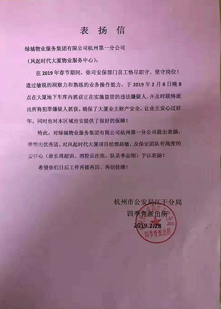 2019年2月28日,浙江绿城保安服务有限公司凤起时代大厦保安队收到一封来自“杭州市公安局江干分局四季青派出所”的表扬信,表扬我司保安队员恪尽职守、坚守岗位,不顾个人生命安危,通过敏锐的洞察力和熟练的业务操作水平抓获偷盗犯罪嫌疑人,确保了业主的生命和财产安全,维护了小区治安的稳定。
