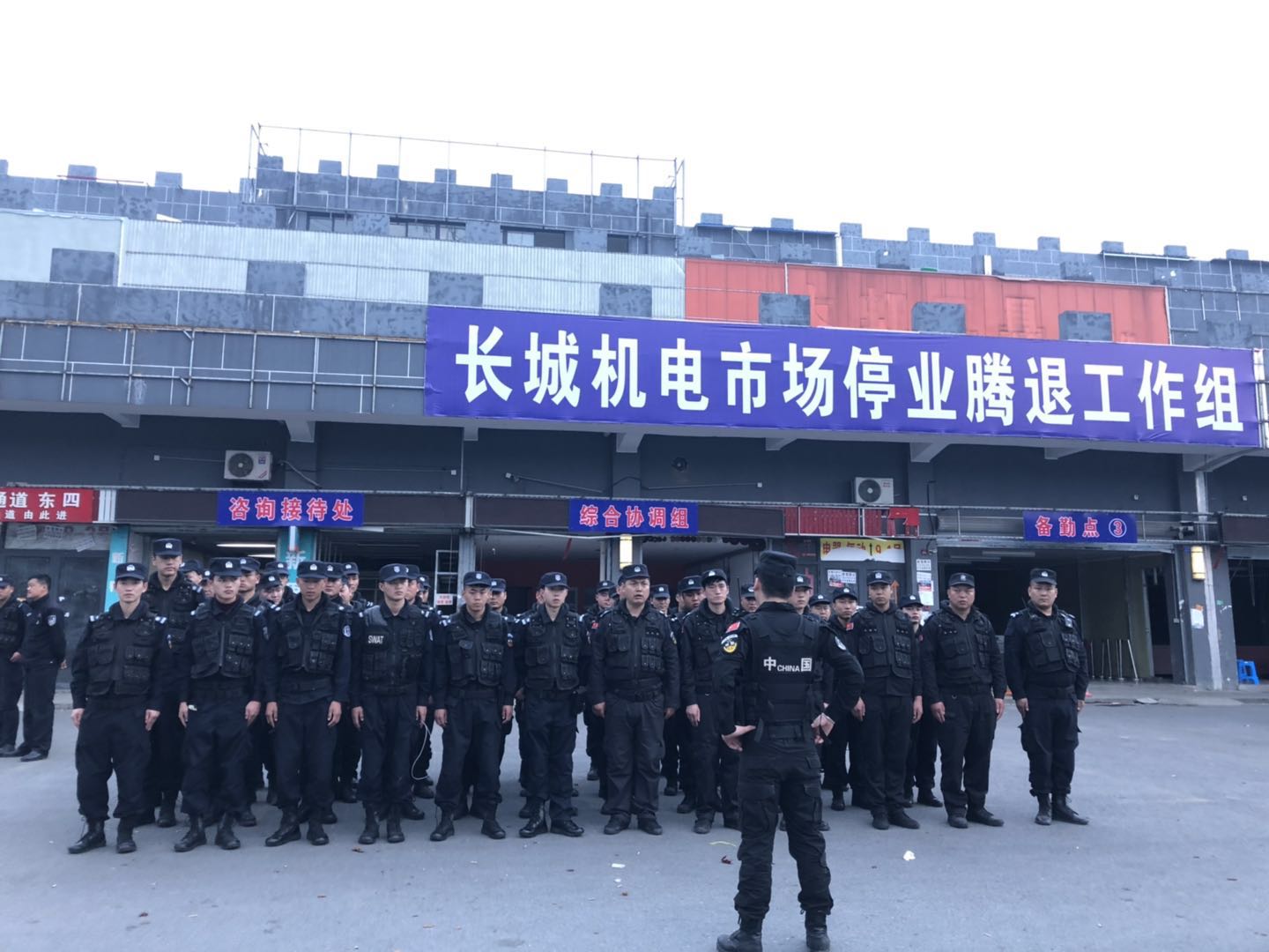 3月19上午长城机电市场开始为期一周的停业腾退工作,问鼎公司受市场方委托派出50名特勤队员协助市场腾退工作。 问鼎保安全体队员恪尽职守文明服务,以最佳的精神面貌开展工作,使腾退工作平稳有序的进行。市场方对问鼎公司保安员工作期间认真负责的态度给予了高度的评价。