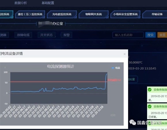 2019年3月20日中午13点10分,杭州国鑫智慧消防中心突然收到平台报警信号,指挥大屏随即弹出智慧用电电流超载告警指示,告警显示报警单位为湍口某办公楼配电箱,该单位电流的正常值最多为55A,当前告警值为94A,电流明显异常。接警员立即向该单位发出火灾预警,告知贵单位报警值超高,务必速派人去处理现场情况。