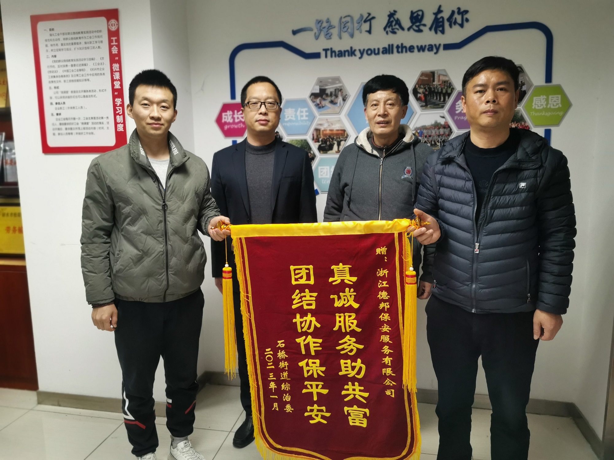 1月12日,杭州市拱墅区石桥街道平安办的薛主任一行专程到访浙江德邦保安服务有限公司并代表街道综治委赠送感谢信及“真诚服务助共富,团结协作保平安”的锦旗,以对浙江德邦保安服务有限公司的卢超同志、凌安同志履职尽责、出色完成各项任务表示感谢。