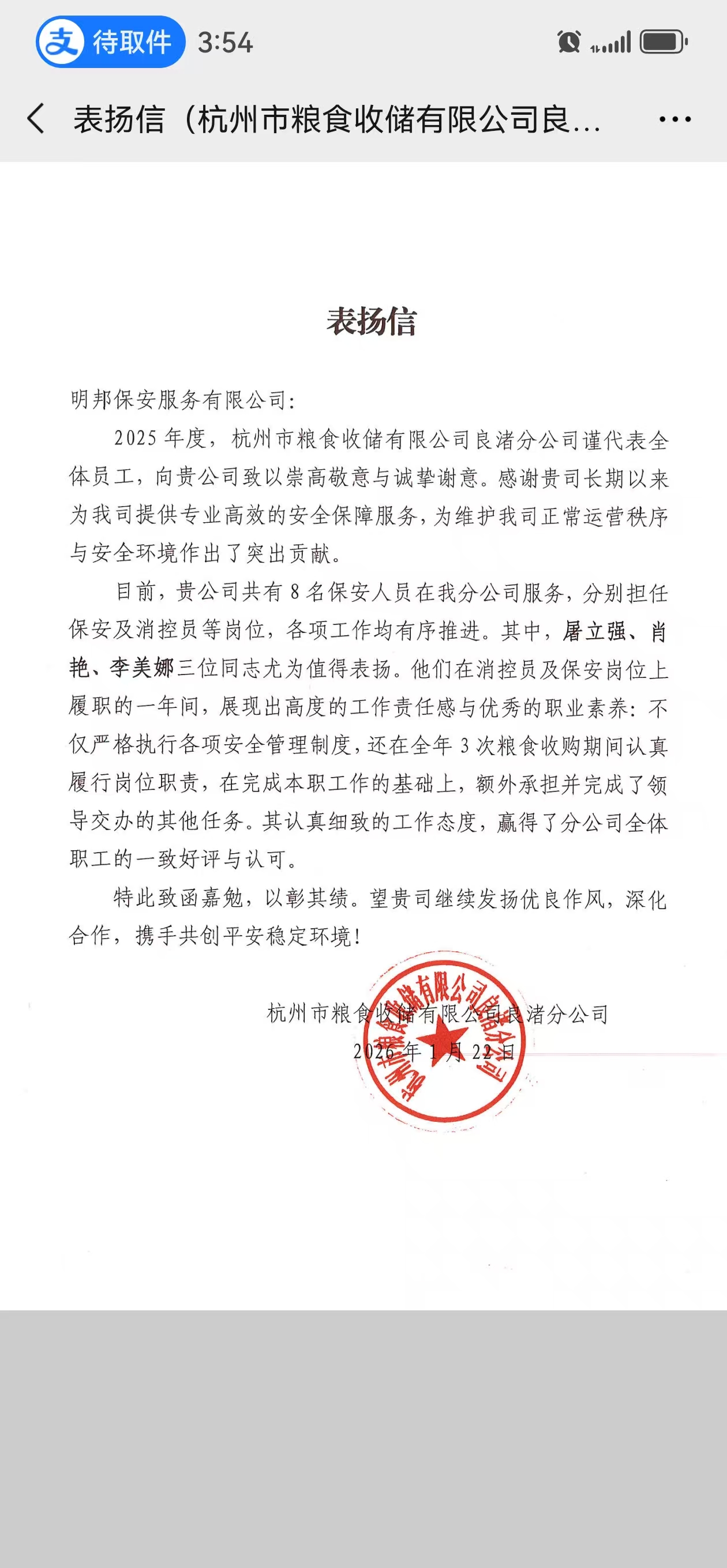 2026年1月22日,杭州明邦保安服务有限公司收到了来自杭州市粮食收储有限公司良渚分公司的表扬信,这不仅是对我们工作的高度认可,更是一份沉甸甸的责任与鼓励。