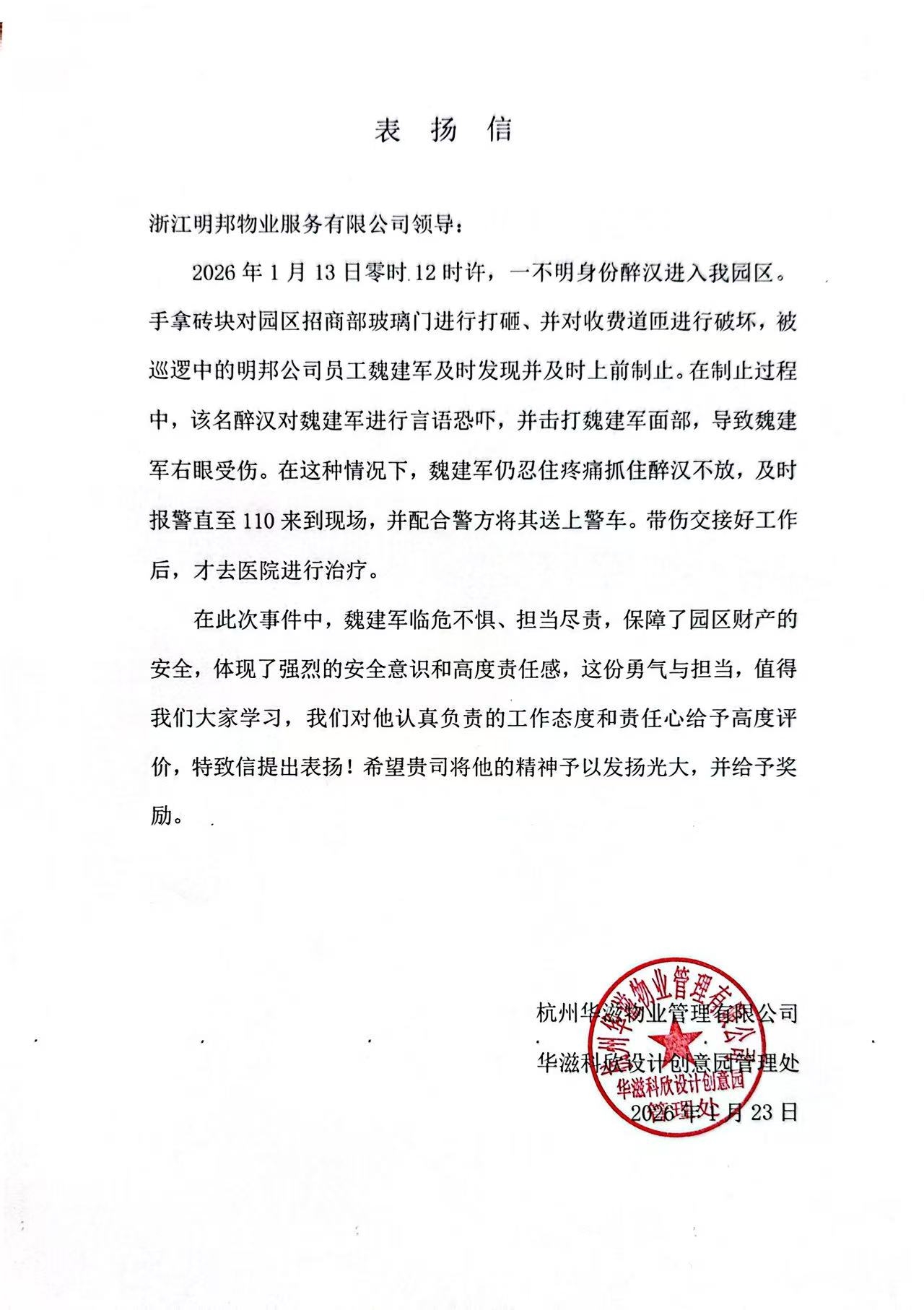 2026 年 1 月 13 日凌晨,一名醉汉闯入园区打砸设施。正在巡逻的魏建军同志第一时间上前制止,面对醉汉的暴力袭击,他右眼受伤仍死死控制住对方,直到协助警方将人带走,交接完工作才去医院治疗。他用血肉之躯守护了园区安全,用行动诠释了 “责任在肩、使命必达” 的职业精神。 这份来自甲方的锦旗与表扬信,不仅是对魏建军个人的认可,更是对明邦物业全体员工专业与担当的肯定。正是无数个像魏建军这样的平凡守护者,用日复一日的坚守,为业主筑牢安全防线。