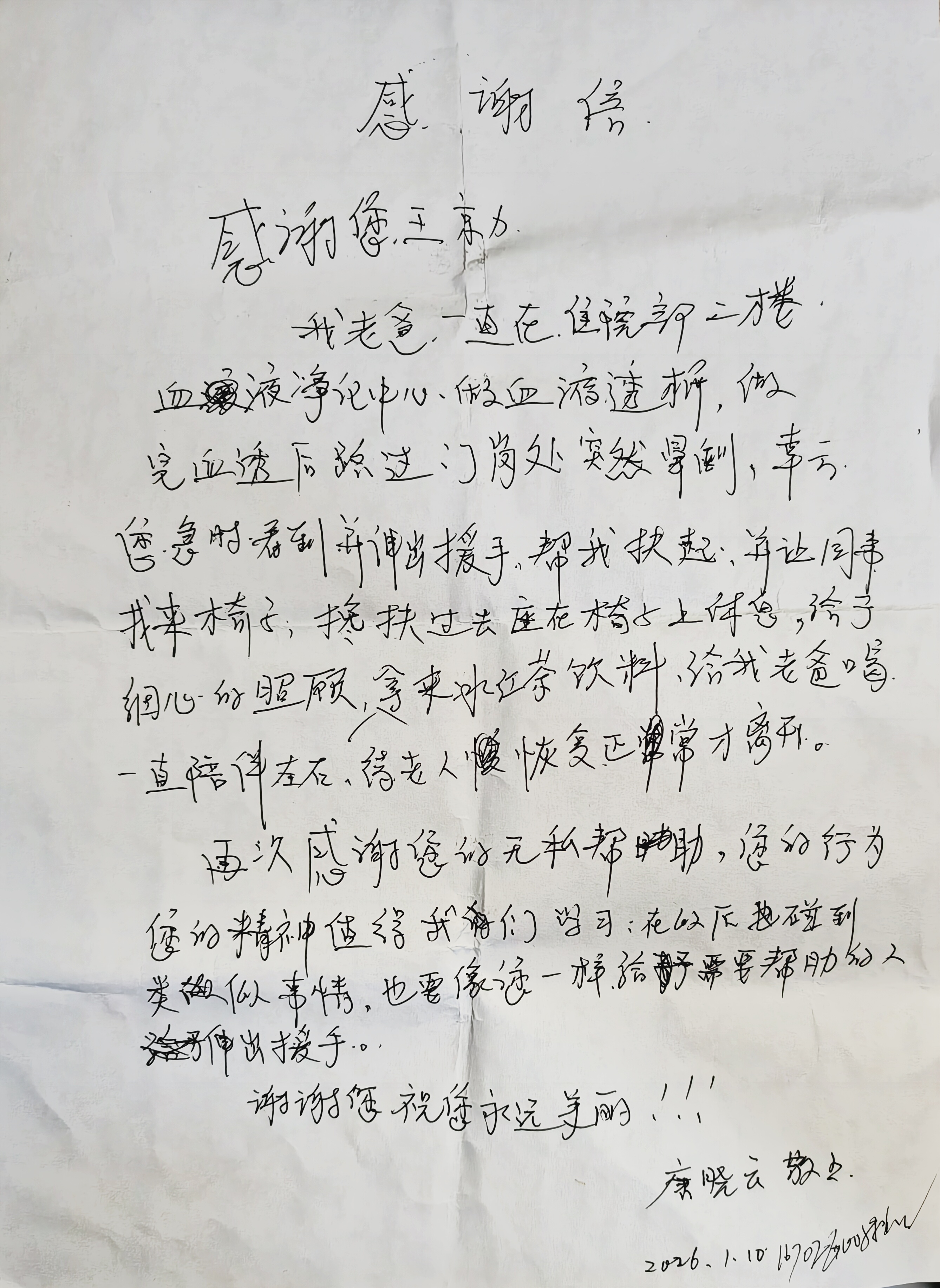 2026年 1 月,她还及时扶起在门岗突然晕倒的血透患者,递水照料、全程陪伴,直至患者好转,家属女士特意致信感谢:“感谢您及时伸出援手,您的精神值得我们学习……”