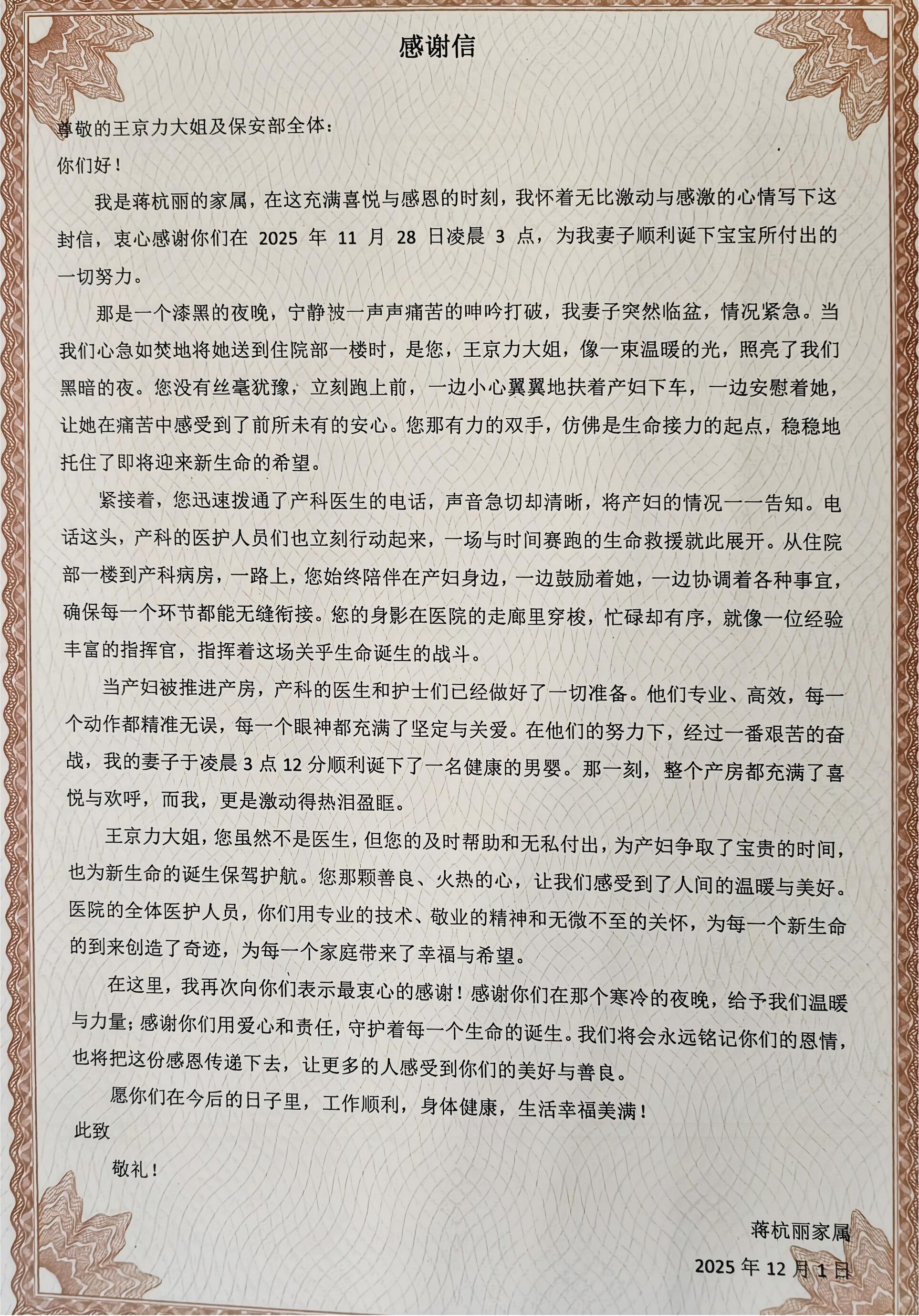 2025 年 11 月 28 日凌晨,她再次挺身而出,协助突发临产的孕妇家属协调产科,全程陪护直至产妇平安生产,又收获一封感谢信。