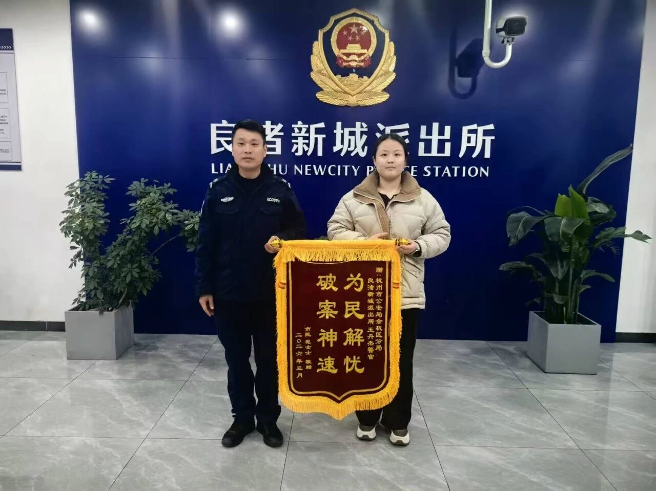 近日,浙江超晟公司驻杭州市公安局余杭区分局良渚新城派出所辅助项目员工曾大发和孔继博在轻装PTU机动队车长王丹杰的带领下,通过耐心劝导、细致讲法,成功说服捡拾人归还钱包,帮助市民范女士寻回遗失的12400元现金,受到市民范女士赠送锦旗赞扬和余杭区公安分局巡控中心发布表扬令通报表彰。